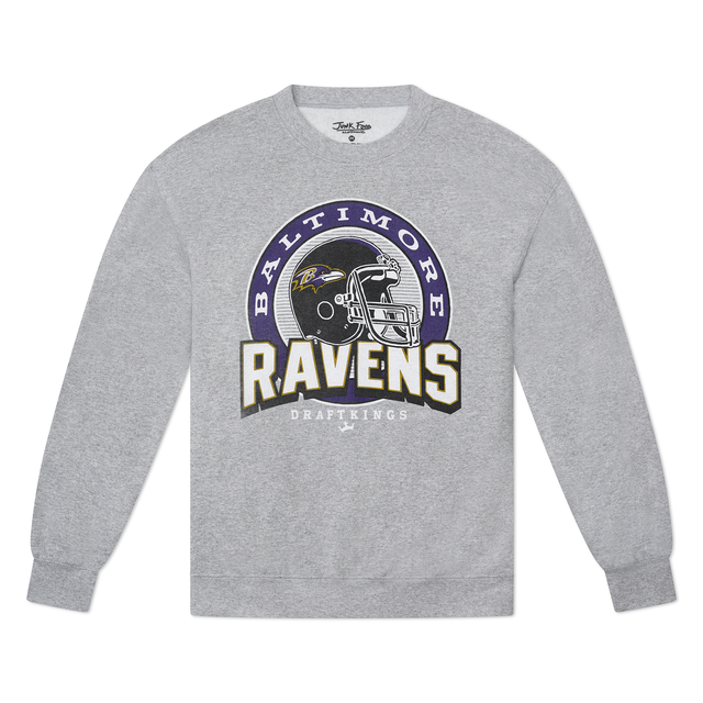 Introducing our Junk Food Baltimore Ravens Backfield Crewneck. Stay cozy with our officially licensed fleece, featuring a classic crewneck design and bold Ravens helmet graphics. Unisex and heavyweight, it's the perfect choice for cooler game days or lounging in comfort. Elevate your game day experience with this exclusive piece.