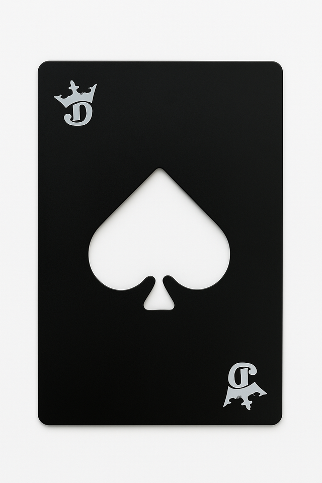 Open your next drink with style and flair using the DraftKings Poker Card Bottle Opener — a sleek, stainless steel tool designed to impress. Its matte black finish and signature spade cutout bring a bold, modern edge to a classic bar essential. Whether you're at home, on the golf course, or at a tailgate, this pocket-sized opener is as functional as it is iconic.