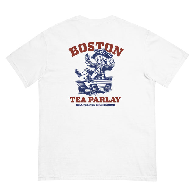 Embrace your love and pride for your city and top-rated sportsbook with DraftKings' Boston Tea Parlay T-Shirt! The front graphic showcases a crown, while the back depicts a historical figure from 1776 riding a duck boat, all accompanied by the phrase "Boston Tea Parlay."