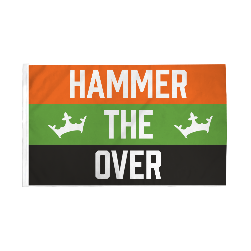 Show your support and rep your team spirit with the Hammer the Over Flag — perfect for game days, fan caves, or office walls. This bold three-color flag features the classic orange, green, and black design with the iconic phrase “Hammer the Over” and two crown accents for a signature look.